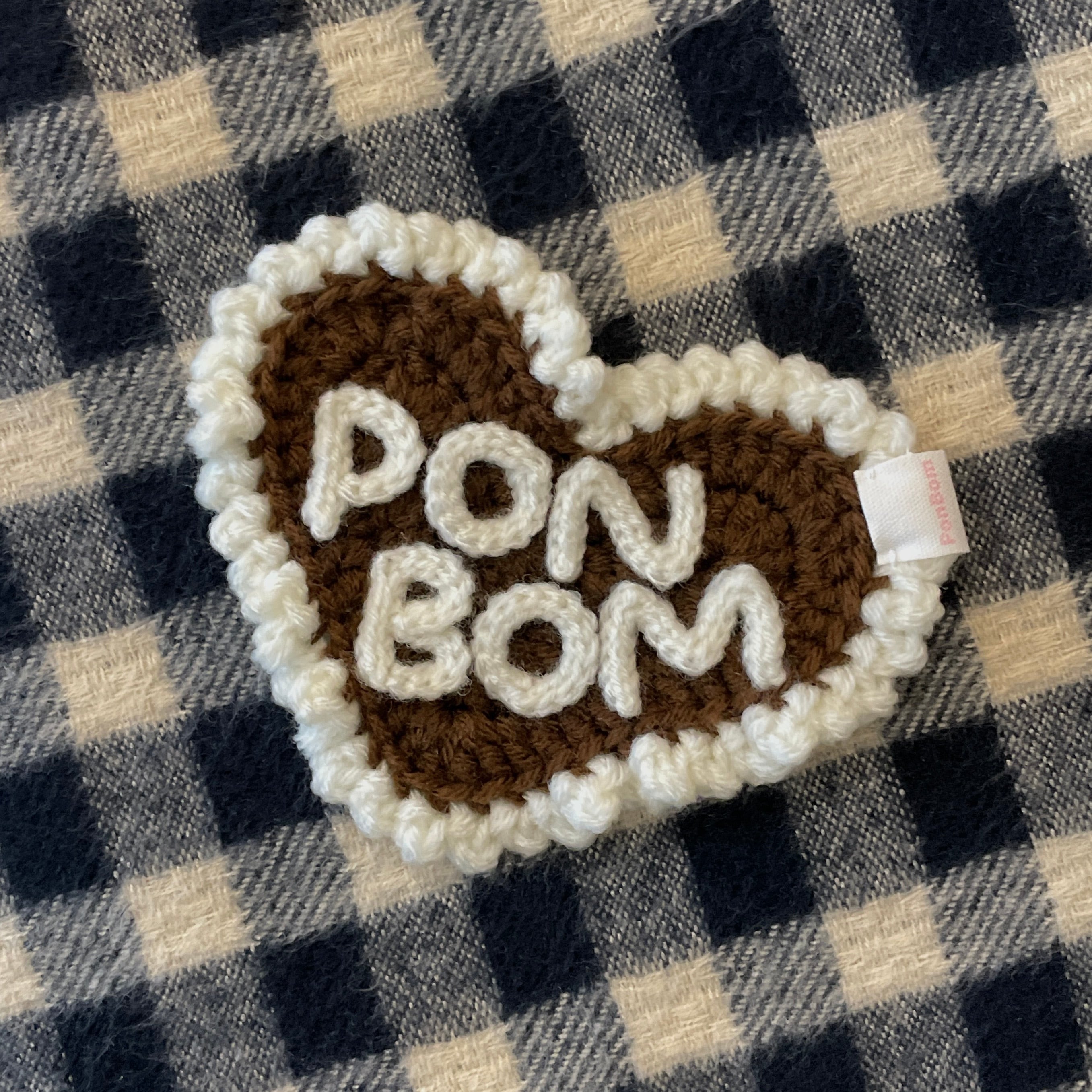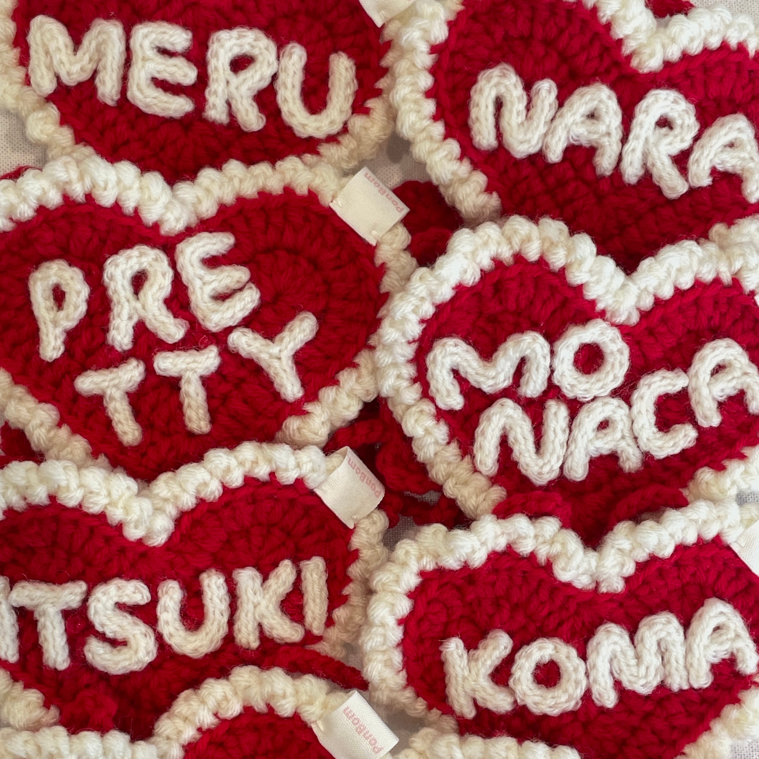 大きなハートにひとつひとつ手編みのアルファベットでお名前をお入れする、愛情をたっぷり詰め込んだビブです♡